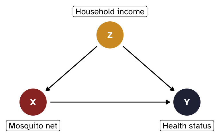 Instead of working with abstract Xs, Ys, and Zs, we’ll make things more concrete with a more realistic example of the effect of mosquito nets on household health status:1