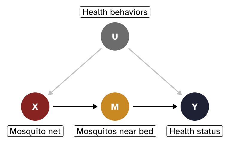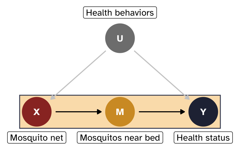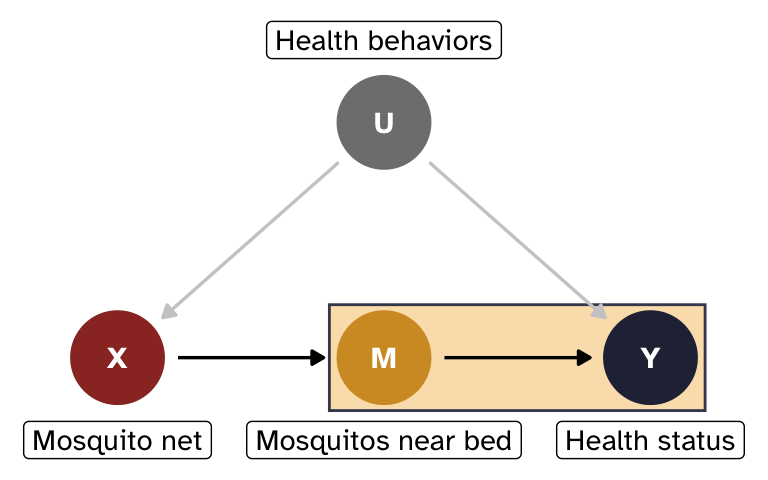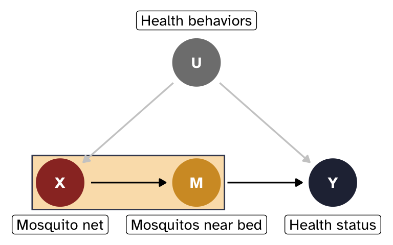- The mediator must also fully mediate the effect of X on Y; there can be no direct path from X \rightarrow Y. Here that means that mosquito nets can only influence health status because they reduce the number of mosquitos near you while sleeping at night. This is a little more plausible—most people tend to only use nets at night while they sleep.